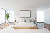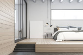 Wnętrze stylowej sypialni z białymi i drewnianymi ścianami, drewniana podłoga, łóżko king size z białym kocem stojącym na dywanie i ściana makiety po prawej stronie. 3d renderowanie