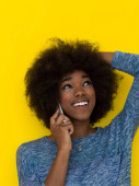 Słodka dziewczyna rozmawia przez telefon. Komunikacja przez telefon w żółtym tle.