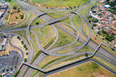 Leć nad złożonym węzłem drogowym. Słoneczny dzień. Nowoczesna Brazylia. Ribeiro Preto, przelot samolotem na dużej wysokości.