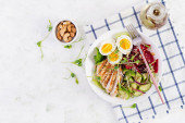 Zdrowe jedzenie. Sałatka z tuńczyka z jajkami, sałatą, pomidorami wiśniowymi, awokado i czerwoną cebulą. Kuchnia francuska. Widok z góry, przestrzeń do kopiowania, układanie płaskie