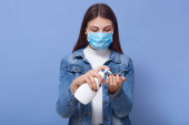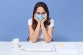 Zdjęcie "Poziome ujęcie uważnej freelancerki zamykającej laptopa, siedzącej przy stole, z filiżanką w pobliżu, noszącej maskę antybakteryjną, przebywającej w kwarantannie, spędzającej czas w izolacji. Pojęcie Covid19." może być wykorzystywane do celów osobistych i komercyjnych zgodnie z warunkami zakupionej licencji Royalty-free. Obraz jest dostępny do pobrania w jakości wysokiej rozdzielczości do 5760x3840.
