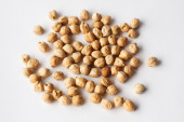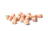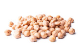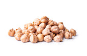 Kupa surowego ciecierzycy wyizolowana na białym tle. Zdrowe wegetariańskie jedzenie. Kupa niegotowanej ciecierzycy. Widok z góry