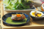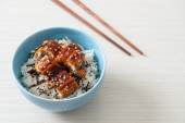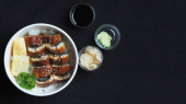 Top view and focus to Unadon or unagi donburi or eel bowl to danie pochodzące z Japonii na czarnym tle.