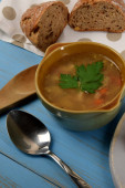 smaczne flaczki zupy w małej misce obok suchego chleba