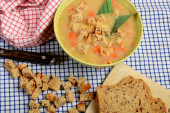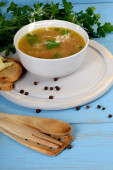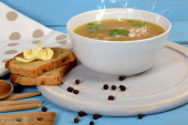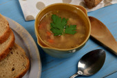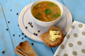zupa fioletowa w białej misce obok chleba i masła