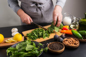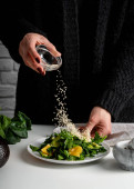 Zdjęcie "Krok po kroku przygotowanie szpinaku, awokado i sałatki pomarańczowej. Krok 6 - łączenie i mieszanie wszystkich składników, widok z góry, ostrość selektywna" może być wykorzystywane do celów osobistych i komercyjnych zgodnie z warunkami zakupionej licencji Royalty-free. Obraz jest dostępny do pobrania w jakości wysokiej rozdzielczości do 5760x3840.