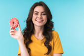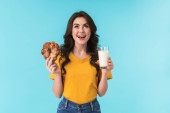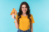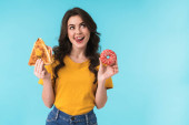 Obraz smutny młoda ładna kobieta pozowanie izolowane nad niebieską ścianą tła gospodarstwa kanapkę i pączka.