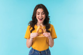 Zdjęcie "Obraz smutny młoda ładna kobieta pozowanie izolowane nad niebieską ścianą tła gospodarstwa kanapkę i pączka." może być wykorzystywane do celów osobistych i komercyjnych zgodnie z warunkami zakupionej licencji Royalty-free. Obraz jest dostępny do pobrania w jakości wysokiej rozdzielczości do 5760x3840.