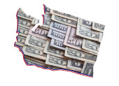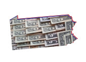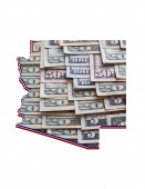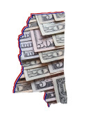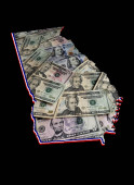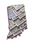 Amerykańskie banknoty dolarowe tworzące i mapa stanu Luizjana i białe tło