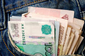 Banknoty wielowalutowe w tylnej kieszeni niebieskich dżinsów. Koncepcja przedsiębiorstwa