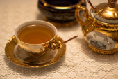 vintage sowieckie filiżanki porcelany herbaty ze spodkami na tureckim dywanie, tradycyjna ceremonia herbaty, światło słoneczne z głębokimi cieniami