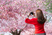 Azji młoda kobieta patrząc w górę na kwiaty wiśni w pełnym rozkwicie i strzelanie