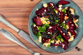 Sałatka domowej roboty z buraków, grzybów i mikrozieleni na patelni