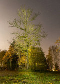 Zdjęcie "mistyczny krajobraz nocy z oświetloną ceglaną wieżą przeciwko nocnemu niebu z gwiazdami" może być wykorzystywane do celów osobistych i komercyjnych zgodnie z warunkami zakupionej licencji Royalty-free. Obraz jest dostępny do pobrania w jakości wysokiej rozdzielczości do 5760x3840.