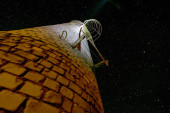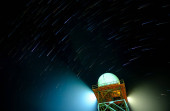 mistyczny krajobraz nocy z oświetloną ceglaną wieżą przeciwko nocnemu niebu z gwiazdami