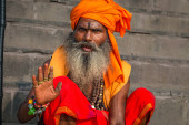 Varanasi, Indie, 13 października 2017: Portret hinduskiego sadhu, świętego człowieka nad rzeką Ganges w Varanasi India