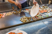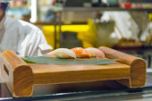 Szef kuchni w restauracji przygotowuje zestaw sushi.