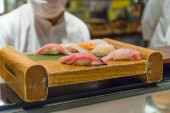 Zdjęcie "Szef kuchni w restauracji przygotowuje zestaw sushi. " może być wykorzystywane do celów osobistych i komercyjnych zgodnie z warunkami zakupionej licencji Royalty-free. Obraz jest dostępny do pobrania w jakości wysokiej rozdzielczości do 5760x3840.