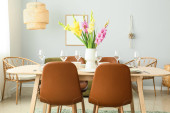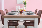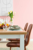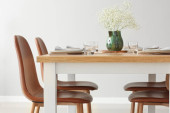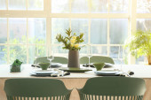 Zdjęcie "Obsługiwany stół w nowoczesnej jadalni" może być wykorzystywane do celów osobistych i komercyjnych zgodnie z warunkami zakupionej licencji Royalty-free. Obraz jest dostępny do pobrania w jakości wysokiej rozdzielczości do 5760x3840.