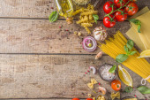 Włoskie składniki żywności do gotowania makaronu spaghetti. Surowy makaron spaghetti z różnymi składnikami - cebulą, pomidorami, czosnkiem, bazylią, pietruszką, serem, oliwą z oliwek. Na białym tle stołu, płaska przestrzeń do kopiowania