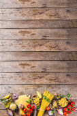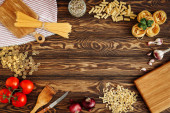 Zestaw różnych surowych makaronów i przypraw. Gotowanie włoskiej koncepcji makaronu ze świeżych ziół i warzyw. Styl rustykalny, drewniane tło