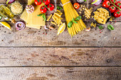 Zdjęcie "Zestaw różnych surowych makaronów i przypraw. Gotowanie włoskiej koncepcji makaronu ze świeżych ziół i warzyw. Styl rustykalny, drewniane tło" może być wykorzystywane do celów osobistych i komercyjnych zgodnie z warunkami zakupionej licencji Royalty-free. Obraz jest dostępny do pobrania w jakości wysokiej rozdzielczości do 5760x3840.