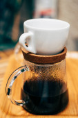 Kawa jest wytwarzana alternatywnie przy użyciu filtra papierowego, a kemex wlewa się z kolby do kubka. Kawiarnia Trzecia fala