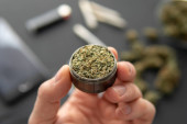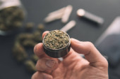 szlifierka w dłoni ze świeżą marihuaną, zioło do stawu, zbliżenie, pąki marihuany na czarnym stole,