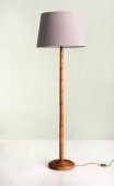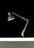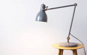 Dwie zabytkowe lampy kątowe, jedna wolnostojąca lampa podłogowa, a druga lampa stołowa na stołku, na szarej ścianie w pomieszczeniu