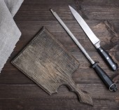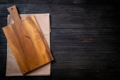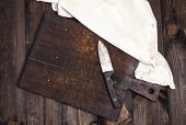 puste stare drewniane deski do krojenia i noże vintage na stole, widok z góry