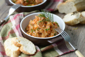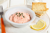 domowej roboty sałatka z sosem marchewkowym i białym w misce na drewnianym tle