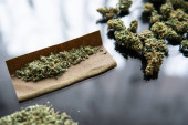 Młynek do ziół Świeża marihuana. Zamknij drzwi. Blunt i Zapalniczki. Pąki konopi w ręku na czarnym tle Tło dla miejsca Kopiuj. CBD i THC na pąkach konopi indyjskich.
