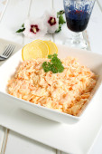 domowej roboty sałatka z sosem marchewkowym i białym w misce na drewnianym tle