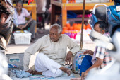 Portret ulicznego sprzedawcy lub sklepikarza na rynku chandni chowk w Old Delhi, Indie