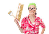 Szczęśliwa kobieta z wałka szczotki stałego ścianę.