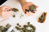 Zdjęcie "Koncepcja zażywania konopi. Kobieta przygotowująca i tocząca marihuanę. Zbliżenie marihuany tępym szlifierką. Kobieta toczy marihuanę na białym tle." może być wykorzystywane do celów osobistych i komercyjnych zgodnie z warunkami zakupionej licencji Royalty-free. Obraz jest dostępny do pobrania w jakości wysokiej rozdzielczości do 5760x3840.