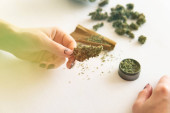 Zdjęcie "Kobieta przygotowująca i tocząca marihuanę. Koncepcja zażywania konopi. Zbliżenie marihuany tępym szlifierką. Kobieta toczy marihuanę na białym tle." może być wykorzystywane do celów osobistych i komercyjnych zgodnie z warunkami zakupionej licencji Royalty-free. Obraz jest dostępny do pobrania w jakości wysokiej rozdzielczości do 5760x3840.