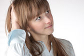 brunetka przebrana była czerwona sukienka, siedząc na kanapie