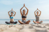 Młode skoncentrowane kobiety ćwiczące jogę poza domem w pobliżu biura