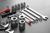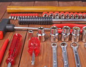 Zestaw wielu różnych czerwonych narzędzi do pracy to szczypce do kluczy młotkowych, śrubokręt, nóż papierowy, dysza śrubokręta, klucz na czarnym tle