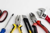 Zestaw wielu różnych czerwonych narzędzi do pracy to szczypce do kluczy młotkowych, śrubokręt, nóż papierowy, dysza śrubokręta, klucz na czarnym tle