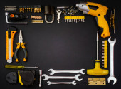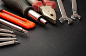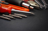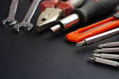 Zdjęcie "Zestaw wielu różnych czerwonych narzędzi do pracy to szczypce do kluczy młotkowych, śrubokręt, nóż papierowy, dysza śrubokręta, klucz na czarnym tle " może być wykorzystywane do celów osobistych i komercyjnych zgodnie z warunkami zakupionej licencji Royalty-free. Obraz jest dostępny do pobrania w jakości wysokiej rozdzielczości do 5760x3840.