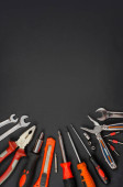 Zestaw wielu różnych czerwonych narzędzi do pracy to szczypce do kluczy młotkowych, śrubokręt, nóż papierowy, dysza śrubokręta, klucz na czarnym tle