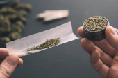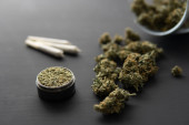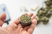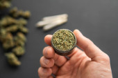 Pąki konopi na czarnym stole, szlifierka ze świeżą marihuaną w ręku, staw z ziołem, widok z góry zbliżenie,