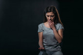 smutna młoda kobieta w masce medycznej trzymając zdjęcie chłopaka z zamkniętymi oczami