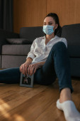 depresja kobieta w masce medycznej oglądanie telewizji podczas siedzenia na kanapie w pobliżu wiadra popcorn i trzymając butelkę wina