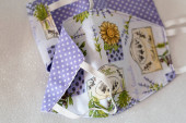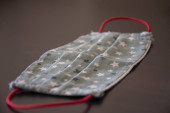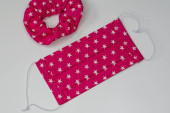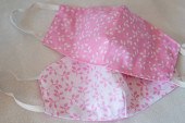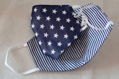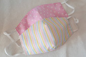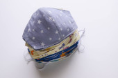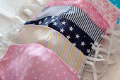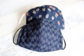 Selektywny nacisk na ręcznie robioną bawełnę odwracalne maski na twarz Widok z góry. Ochrona przed śliną, kaszlem, kurzem, zanieczyszczeniem, wirusem, bakteriami, COVID-19.