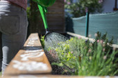 Podlewanie warzyw i ziół w podniesionym łóżku. Świeże rośliny i gleba.
