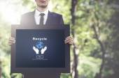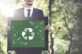 Biznesmen trzymający w ręku tabletkę z ikoną recyklingu