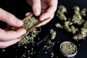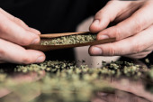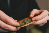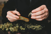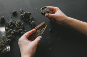 Facet rzuca marihuaną tępym narzędziem. Zamknij marihuanę z zapalniczką. Człowiek toczący marihuanę tępy konopi.